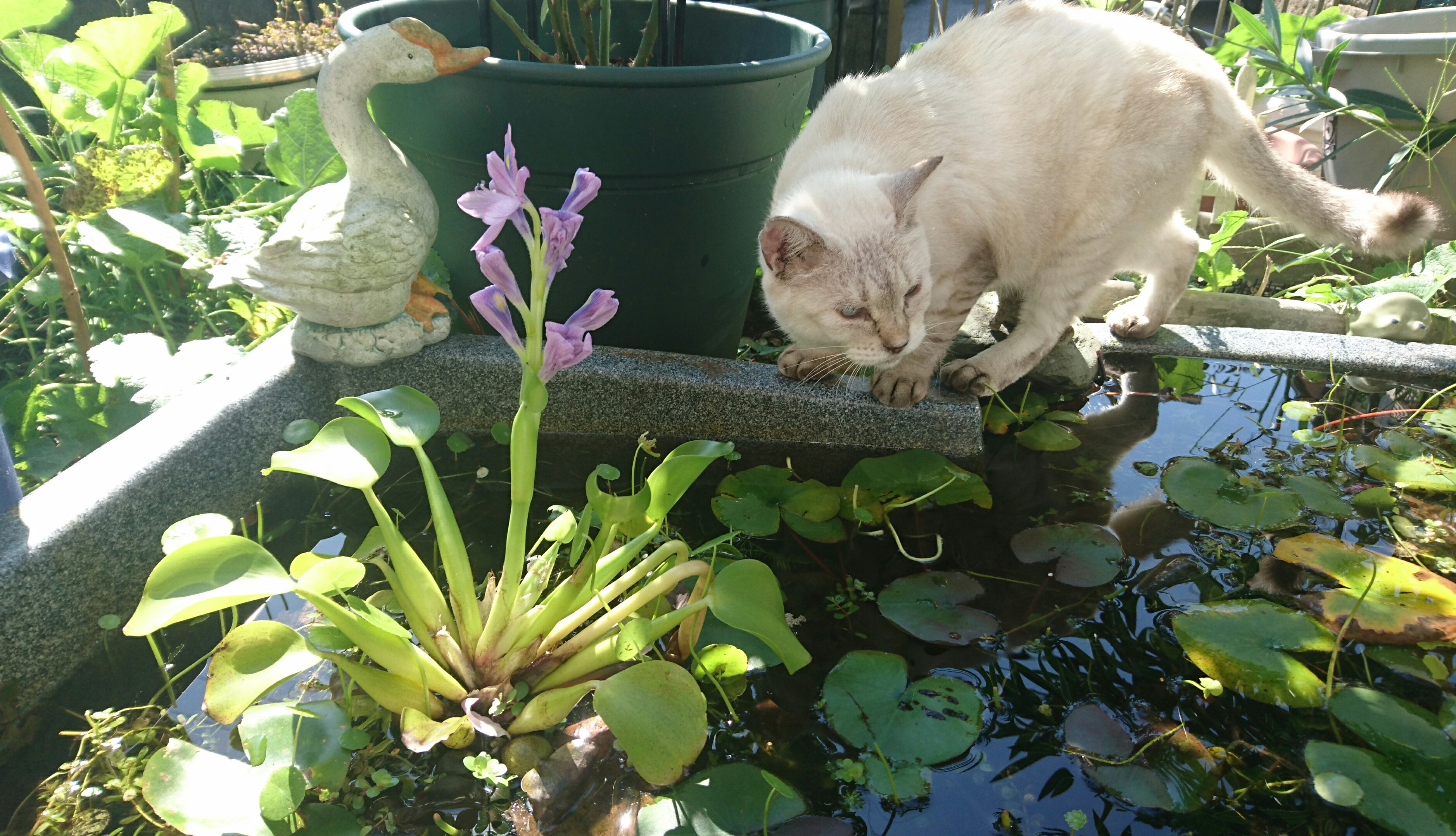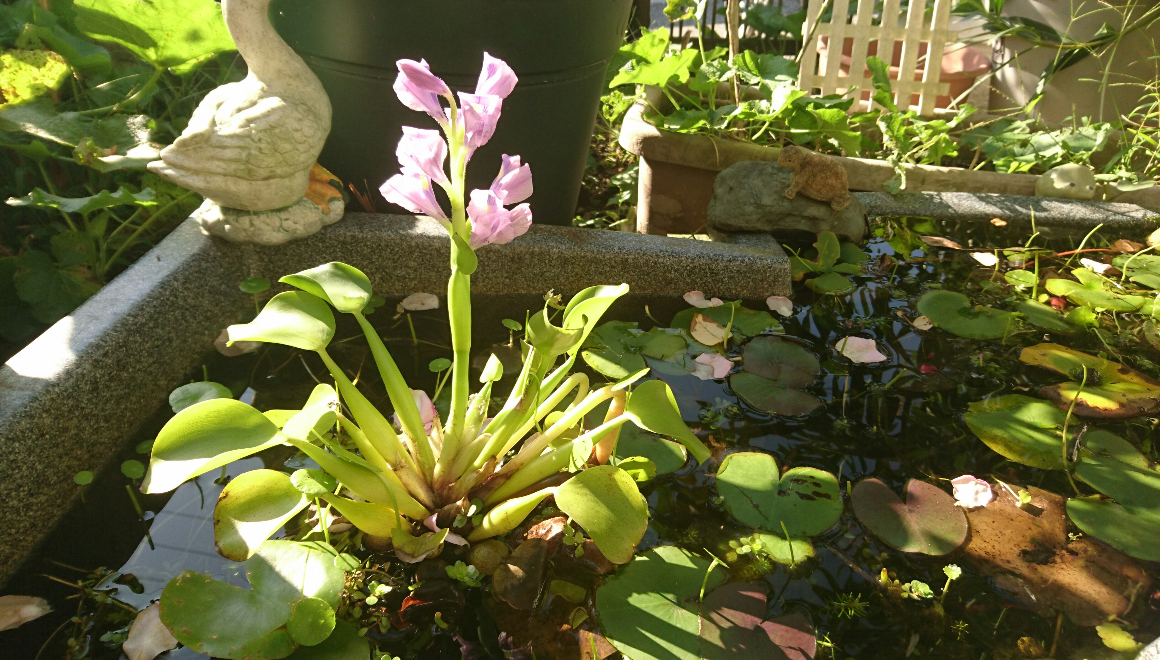 庭のホテイアオイの花が咲きました(^o^)/♪ ホテイアオイは外来種で、川や池、沼などで水面を覆いつくすくらい増えるので嫌われてるんですが、1つだけ庭の池にいます(^o^)紫色の花が咲きます(^o^)